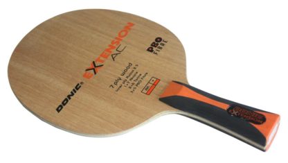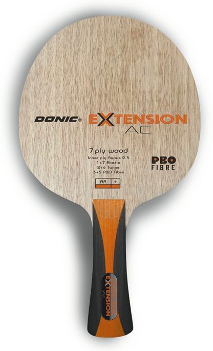 Uma raquete bastante fina (4,7 mm) que lembra a primeira geração de lâminas de carbono, com uma estrutura de camadas interessante: o suave abeto combinado com uma camada interna de ayous (dura) cria um controle excepcional. A fibra de PBO (camadas de carbono) garantem estabilidade e um maior sweet-spot (ponto ideal de impacto). As robustas camadas externas de acácia produzem grande resistência. Donic Extension AC é uma raquete para o jogador que deseja ter as qualidades de uma madeira carbonada com o melhor controle possível.