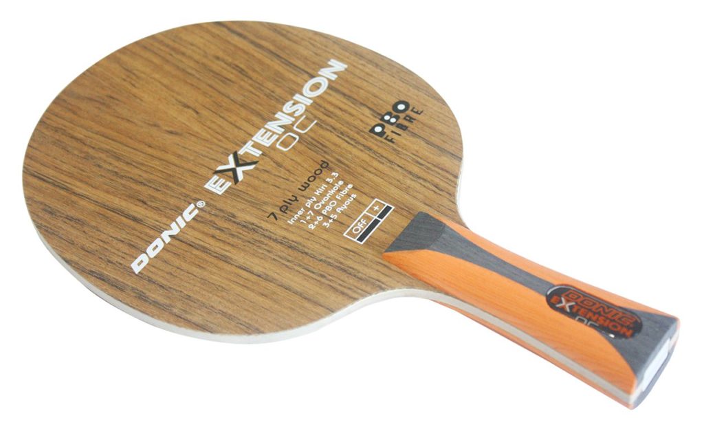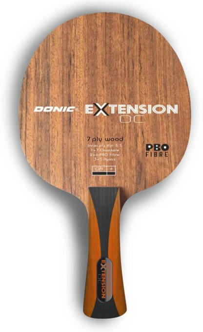 O Extension OC é uma raquete ofensiva muito rápida e relativamente dura. As camadas externas em ovangkol são extremamente duras e, em combinação com as camadas PBO (fibra de carbono), criam uma aceleração superior. O ovangkol é uma madeira africana, usada na fabricação de guitarras. Uma lâmina para o especialista, que ganha pontos com golpes rápidos e poderosos. Uma das mais rápidas da Donic.