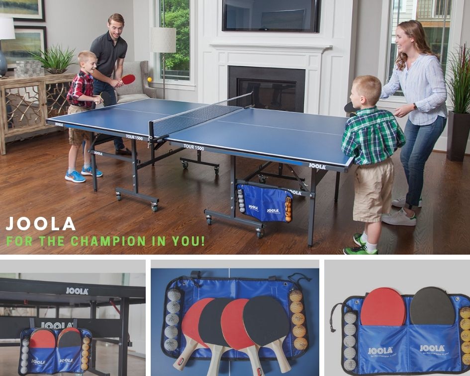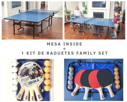 O conjunto Family Set de tênis de mesa feito para toda família, ele inclui 4 raquetes, dez bolas (5 brancas e 5 laranjas), e uma maleta de armazenamento acessível que pode ser anexada sob a mesa.