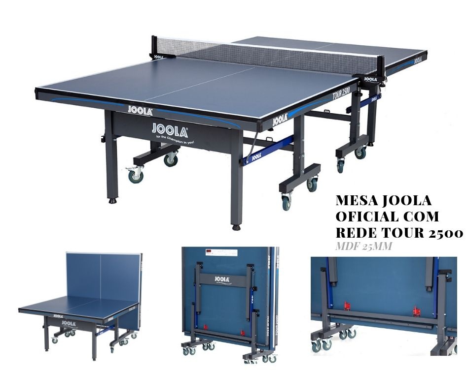 A mesa Tour 2500 apresenta uma superfície de 25mm pintado em azul e 50mm de estrutura de aço com revestimento em pó preto. A superfície de 25mm garante pingos de bola mais consistentes. Cada metade da mesa possui pernas dobráveis automáticas e quatro rodas com travas. Um dispositivo de anti-inclinação está incluído para maior segurança.