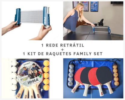 O conjunto Family Set de tênis de mesa feito para toda família, ele inclui 4 raquetes, dez bolas (5 brancas e 5 laranjas), e uma maleta de armazenamento acessível que pode ser anexada sob a mesa.