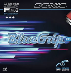 Uma superfície extremamente aderente do tipo chinês, combinada com uma esponja azul de poros finos, que garantem um poderoso efeito catapulta. Suporta perfeitamente um jogo de ataque de ambos os lados. Donic BlueGrip R1 tem um toque um pouco mais suave e ajuda a compensar a perda de efeito que a bola de plástico acarretou. O tempo de permanência mais longo ao atingir a bola resulta em um aumento significativo de efeito nos saques e retornos. Borracha fabricada na Alemanha.